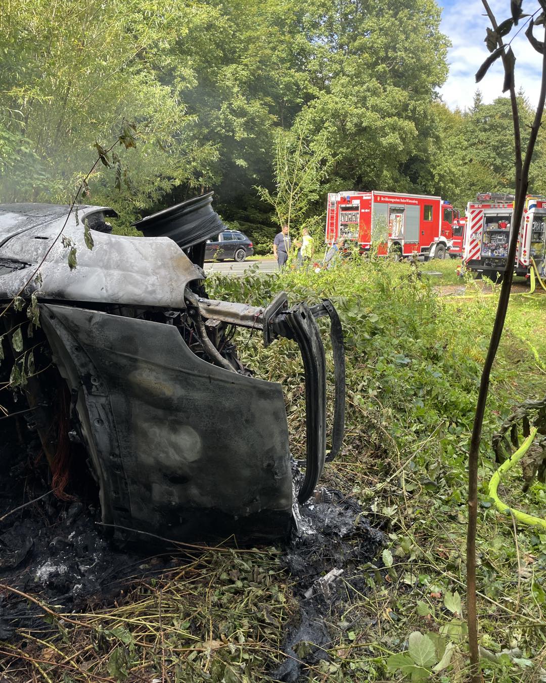 Nach einem Verkehrsunfall auf regennasser Fahrbahn geriet das verunfallte Fahrzeug auf der K4105 zwischen Schönbrunn und Schwanheim in Brand.