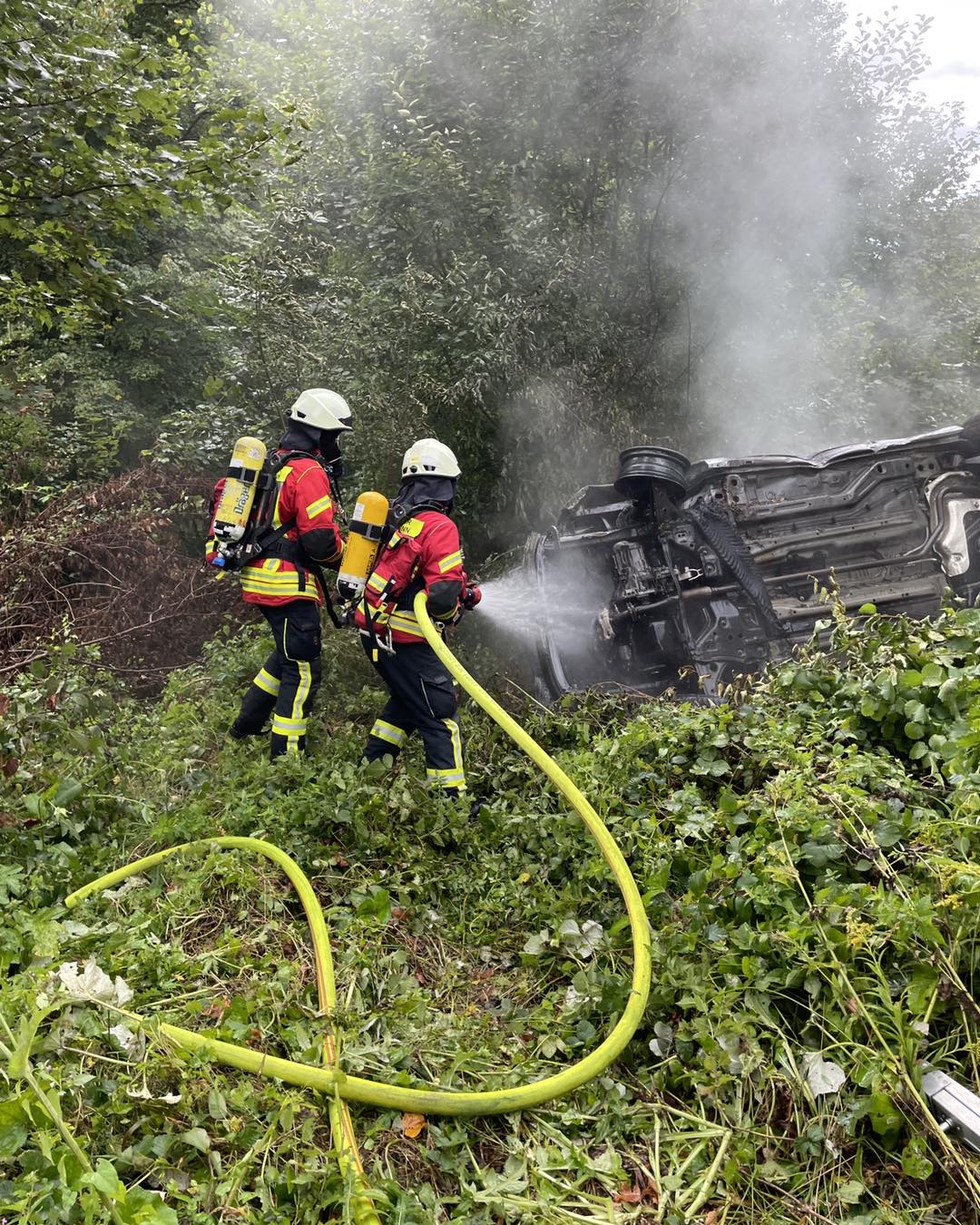 Die Aufgabe der Feuerwehr beschränkte sich auf die Betreuung der verunfallten Person sowie dem Löschen des brennenden Fahrzeugs.