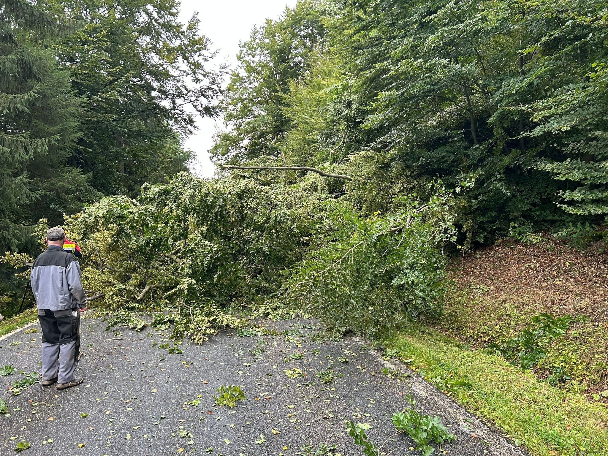 Am Montagvormittag wurden wir auf die K4105 zwischen Schönbrunn und Schwanheim alarmiert. Hier war ein starker Baum infolge des mäßigen Windes abgebrochen und auf die Fahrbahn gefallen. Der Baumstamm und die Äste wurde mit der Motorsäge zerkleinert und die Straße gesäubert.